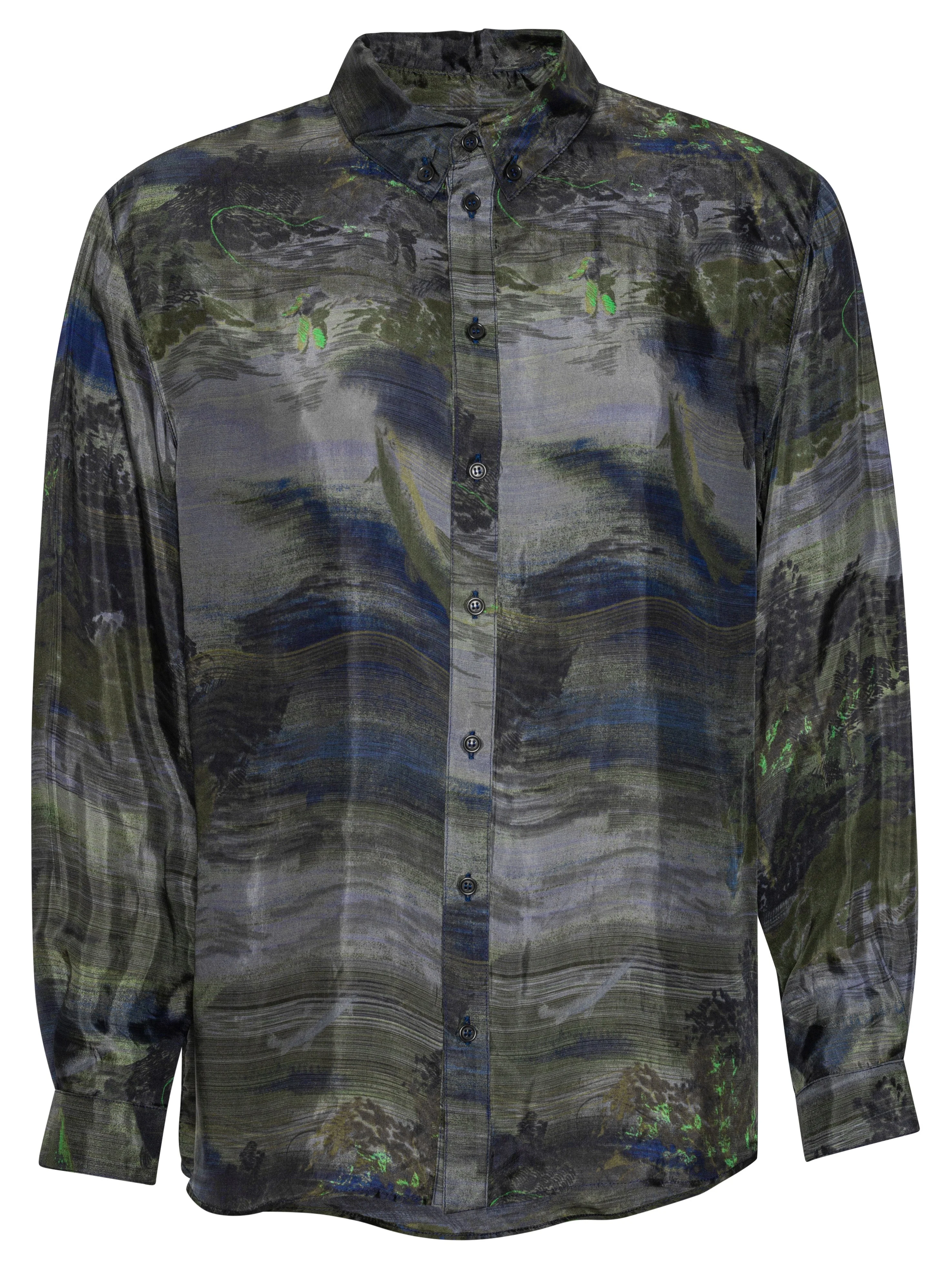 Block Shirt in Fishes Light from Henrik Vibskov's Autumn Winter 2025 Studio collection "A Bit Overwhelmed by the Opaque Resonance" Highlights - dark tones - classic collar - front button closure - long sleeves - curved hem Signature fabric - This fabric is made in Turkey by Ipeker, a family owned textile company dating back to 1930. It is specially printed on a ‘vegan silk’ with a Henrik Vibskov artwork, showcasing fishermen catching fish in a mountain creek. Model is 187cm tall and wearing a size M Made in Bulgaria Designer ID: AW25STUD-M211 Colour ID: 949 Fishes Light Materials 53% Cupro 47% Viscose