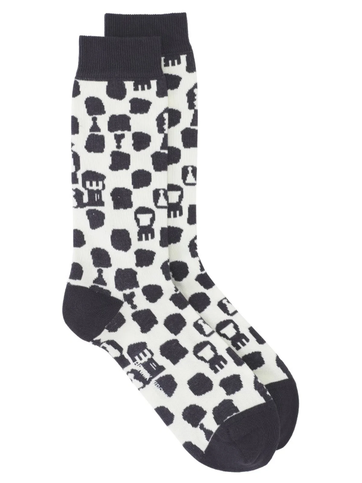 Chess Socks Homme in Black White Gambit from Henrik Vibskov's AW24 Studio Collection 'Daily Chewing Gum Therapy' Highlights - socks - mens Made in Portugal Composition: 74% Organic Cotton 13% Polyamide 12% Recycled Polyamide 1% Elastane Designer ID: AW24STUD-S908 Colour ID: 946 Black White Gambit Materials 74% Organic Cotton 13% Polyamide 12% Recycled Polyamide 1% Elastane