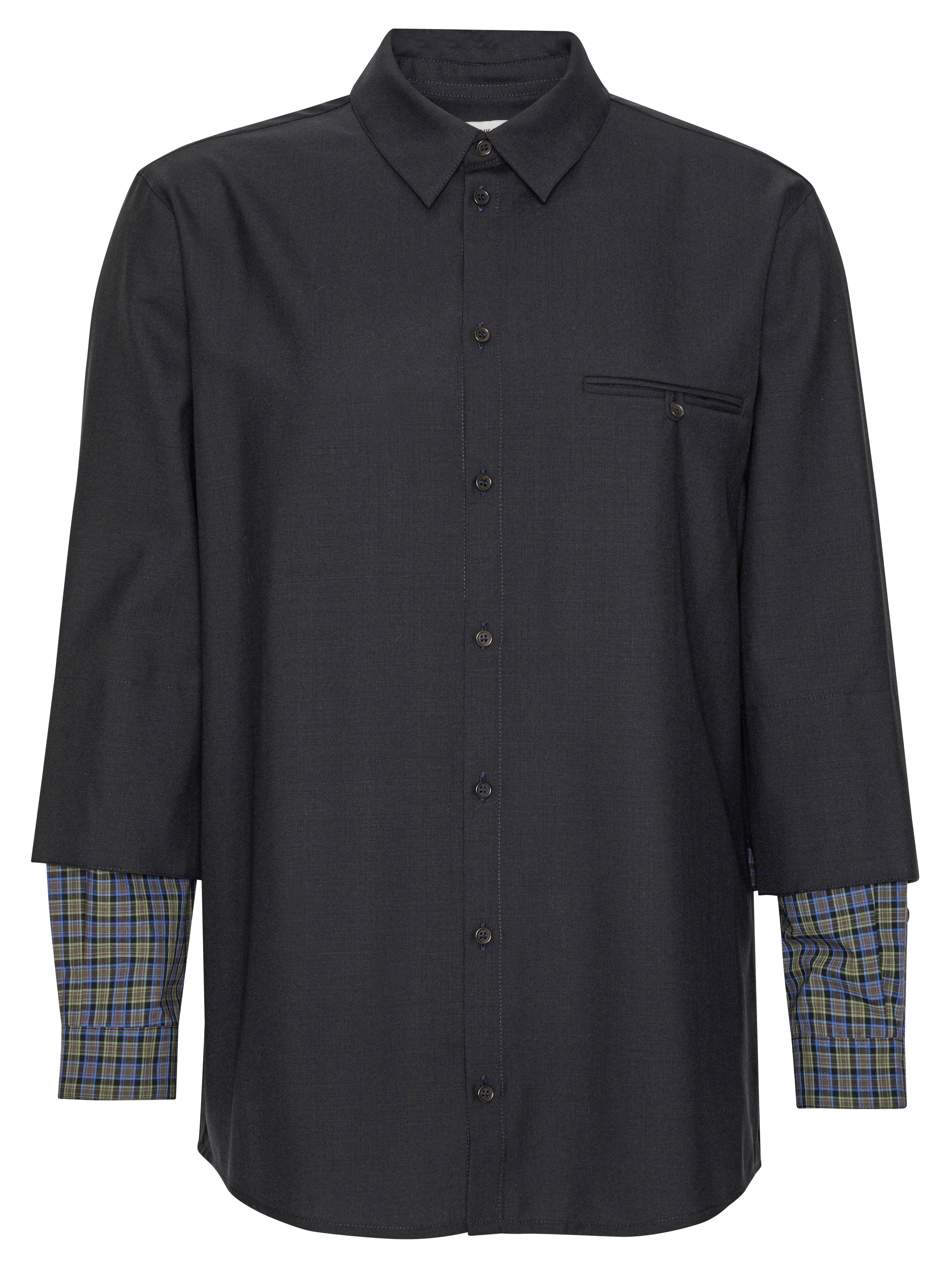 Blou Shirt in Tropical Navy from Henrik Vibskov's Autumn Winter 2025 Studio collection "A Bit Overwhelmed by the Opaque Resonance" Highlights - black - checkered lining - layered design - classic collar - front button closure - long sleeves - curved hem Model is 187cm tall and wearing a size M Made in Bulgaria Designer ID: AW25STUD-M209 Colour ID: 790 Tropical Navy Materials 100% Wool