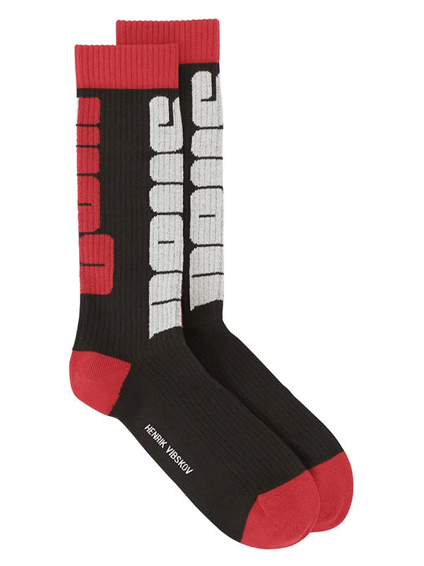 Enigma Sport Socks Homme in Black Beige Red Bold from Henrik Vibskov's AW24 Studio Collection 'Daily Chewing Gum Therapy' Highlights - black, beige, red - mens Size: 42-46 EU Made in Portugal Designer ID: AW24STUD-S913 Colour ID: 952 Black Beige Red Bold Materials 76% Organic Cotton 10% Polyamide 12% Recycled Polyamide 2% Elastane