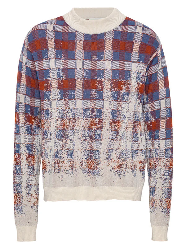 Faded Knit Jumper in Blurry Grey Red Check from Henrik Vibskov's SS25 Studio Collection 'The Orchestra of the Soft Assistance' Highlights - blue, red, white checks - crewneck - long sleeves - ribbed hems The model is 184 cm and is wearing a size Medium Made in Bulgaria Designer ID: SS25STUD-M706 Colour ID: 903 Blurry Grey Red Check Materials 100% Organic Cotton