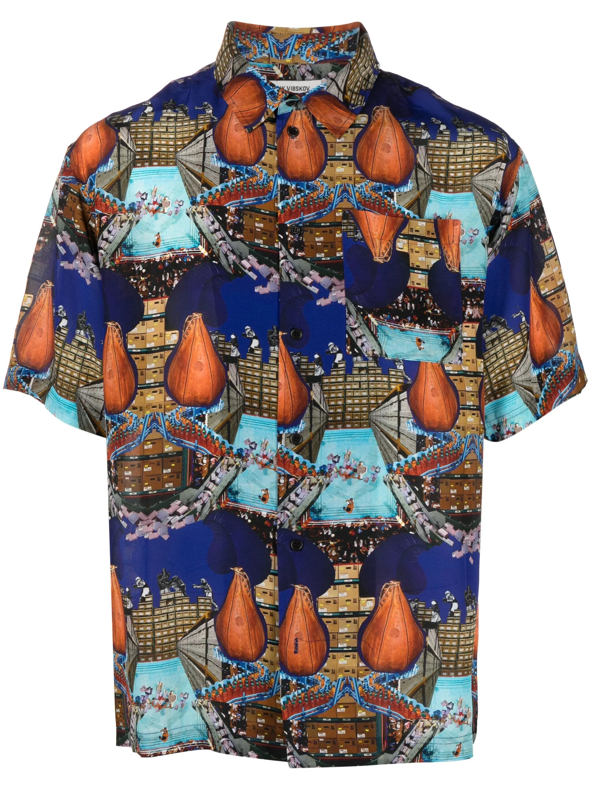 Transfered Shirt in Boxing Navy Collage from Henrik Vibskov's Spring Summer 2024 collection 'The Unboxing Waltz Tutorial'. Highlights - blue/multicolour - crepe de chine - all-over graphic print - box-pleat detail - semi-sheer construction - pointed flat collar - front button fastening - drop shoulder - short sleeves - chest patch pocket - straight hem - unlined Made in China Designer ID: SS24STUD-M203 Colour ID: 752, Boxing Navy Collage Materials 100% Silk