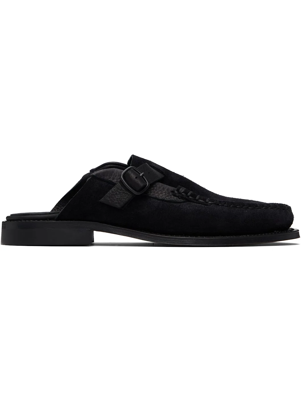 Handcrafted calfskin suede slip-on loafers. · Moc toe · Pin-buckle strap and cutouts at vamp · Calfskin suede lining · Stacked heel with rubber injection · Polished calfskin sole Supplier color: Black Calfskin. Made in Spain 261991M231013