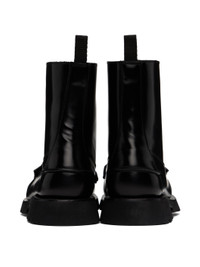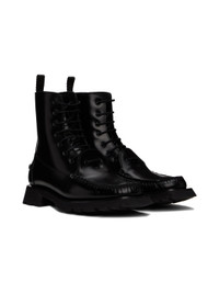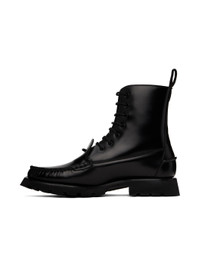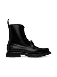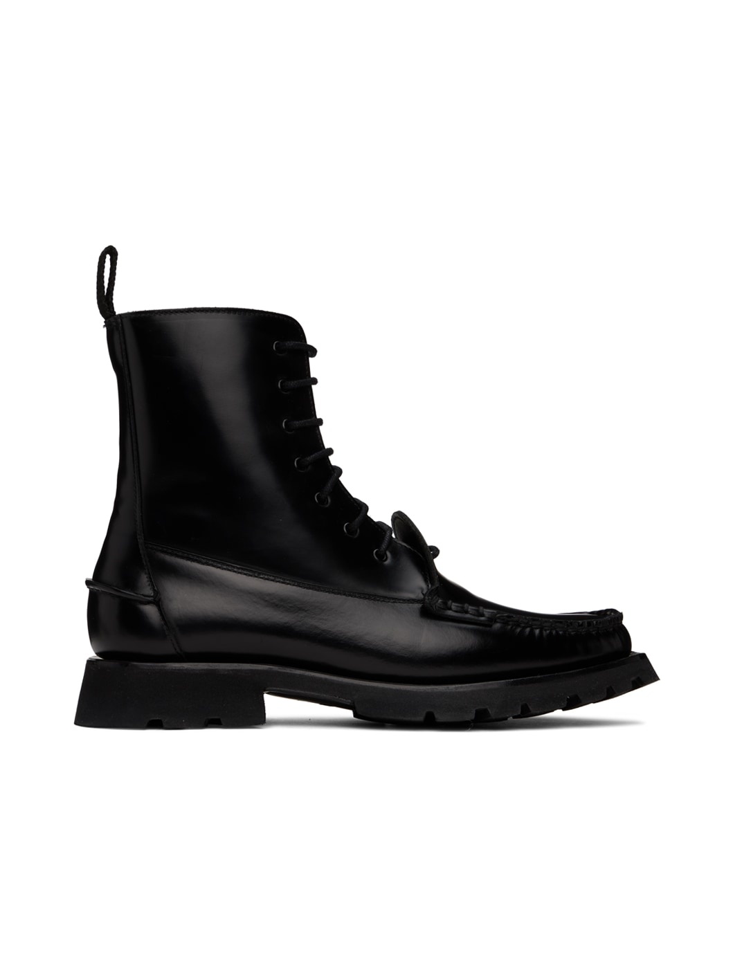 Handcrafted ankle-high polished calfskin boots in black. · Moc toe · Lace-up closure · Webbing pull-loop at collar · Treaded foam rubber sole · Heel: 1.25" Supplier color: Black