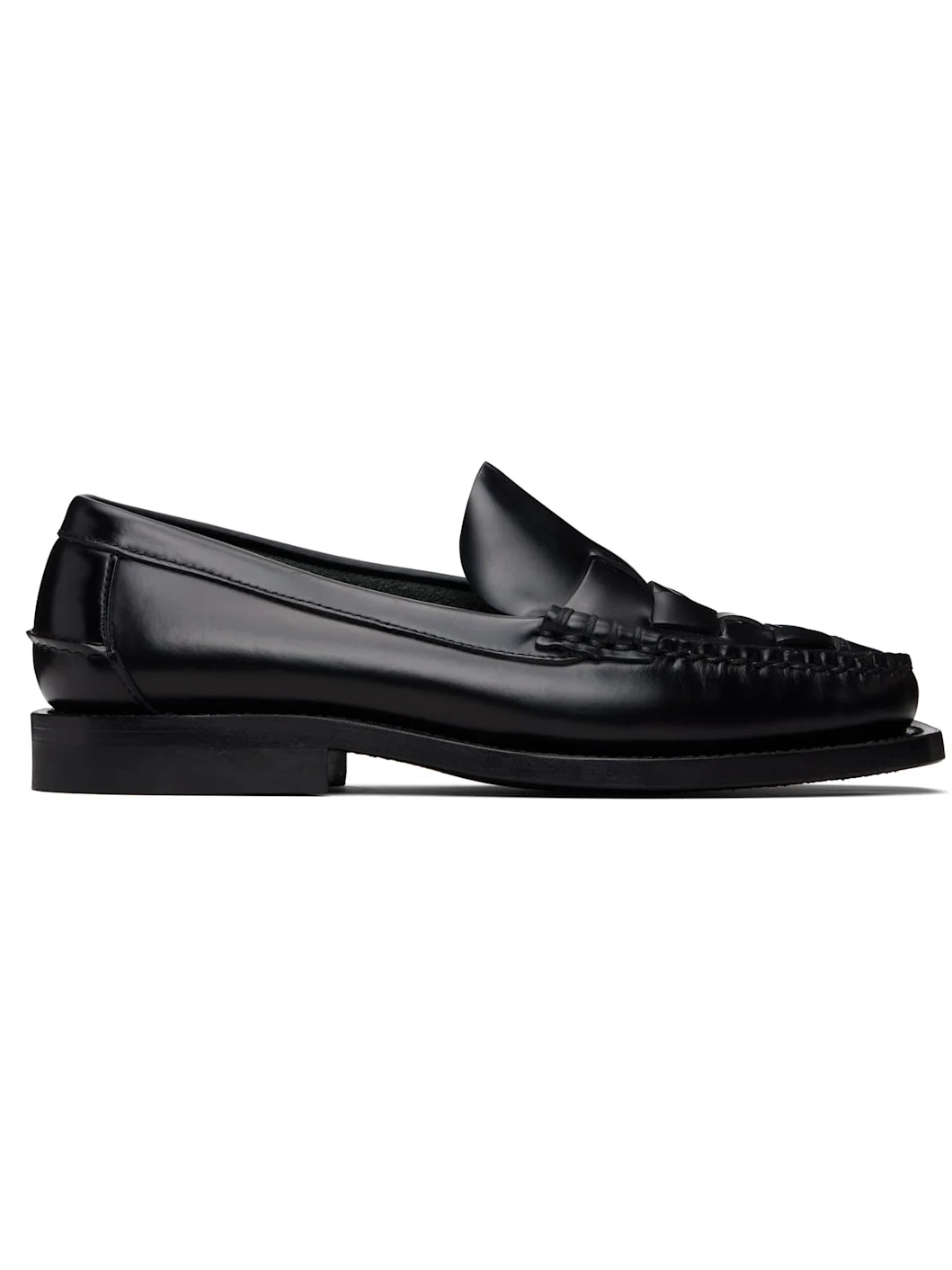 Handcrafted polished calfskin loafers. · Square moc toe · Woven detailing at vamp · Pinched seam at heel counter · Calfskin suede lining · Stacked heel with rubber injection · Polished calfskin sole Supplier color: Black Calfskin. Made in Spain 261991M231003
