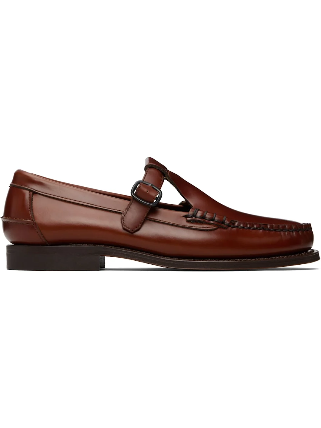 Polished calfskin loafers. · Moc toe · Pin-buckle strap and cutouts at vamp · Pinched seam at heel counter · Calfskin suede lining · Stacked heel with rubber injection · Calfskin sole Supplier color: Tan Calfskin. Made in Spain 261991M231019