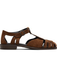 Handcrafted calfskin suede sandals. · Cutouts throughout · Woven detailing at vamp · Pin-buckle ankle strap · Logo embossed at padded footbed · Stacked calfskin heel · Calfskin sole Supplier color: Tan Calfskin. Made in Spain 252991M234009