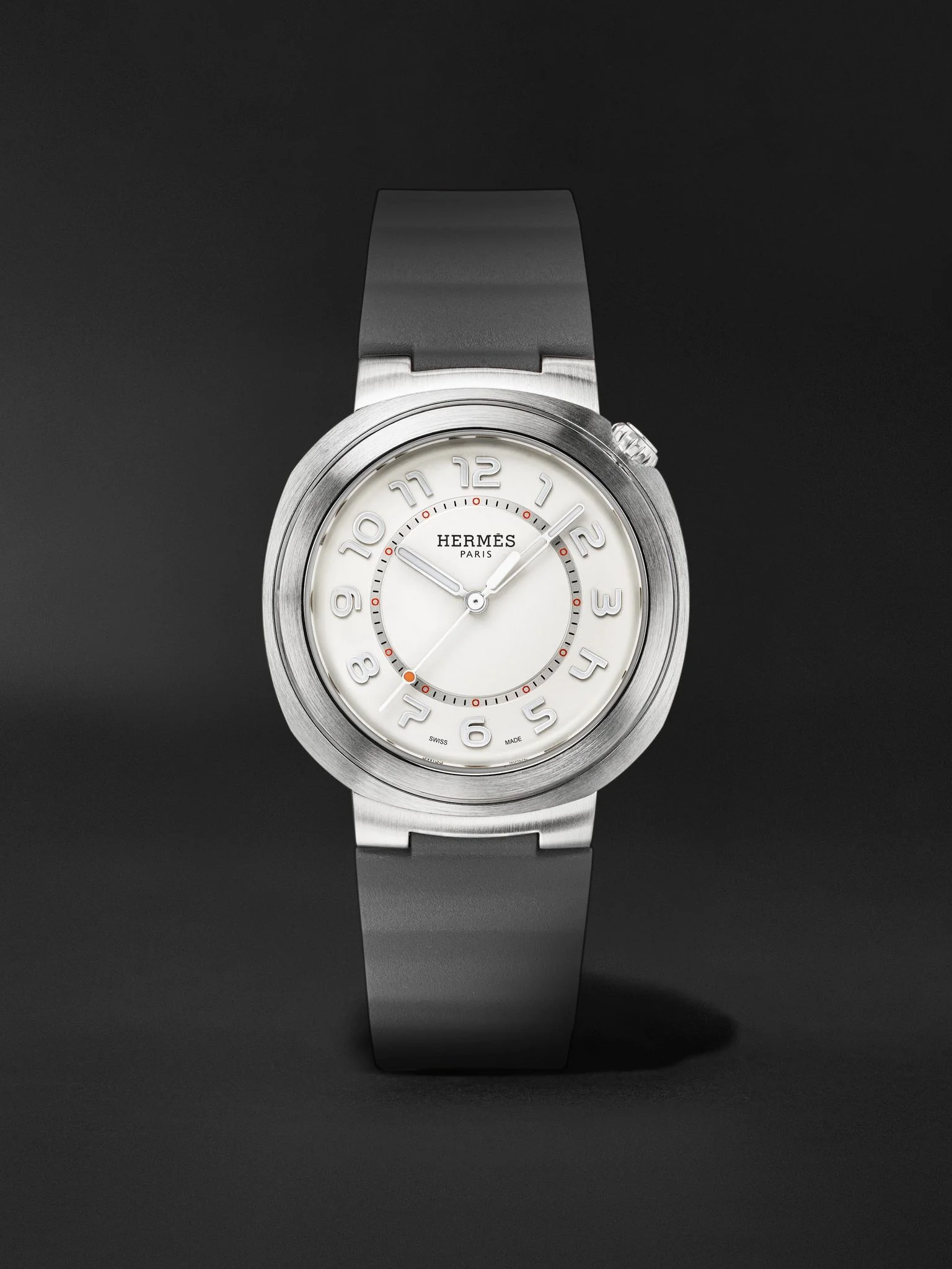 Hermes' 'Cut' watch makes a great daily driver – the 36mm dial is clearly laid out with Super-LumiNova® numerals, embossed indices, red markers and baton-shaped hour, minute and second hands. It has a satin-brushed stainless steel case and robust rubber strap, while the crown features the signature orange 'H'. Inside, there's a calibre H1912 automatic movement engineered by Swiss workshop Manufacture Vaucher. For warranty information, please refer to details & care Details & Care Movement - Swiss-made calibre H1912 automatic movement with 50-hour power reserve - 28 jewels, 28,800 Vph Functions - Hour, minute and second hands Dial - White opaline dial - White Super-LumiNova® hands and Arabic numerals, orange markers Case - Satin-finished stainless steel - Crown for time adjustments and manual winding - Sapphire glass crystal - Exhibition case back - Folding buckle-fastening grey rubber strap Specifications - Case diameter: 36mm; strap width: 20mm - Water resistance: 10 bar - Comes in a presentation box - Reference number: 404924WW00 We offer a two-year warranty for all working parts and manufacturing faults for luxury watches. For more information, contact one of our experts by emailing watches@mrporter.com