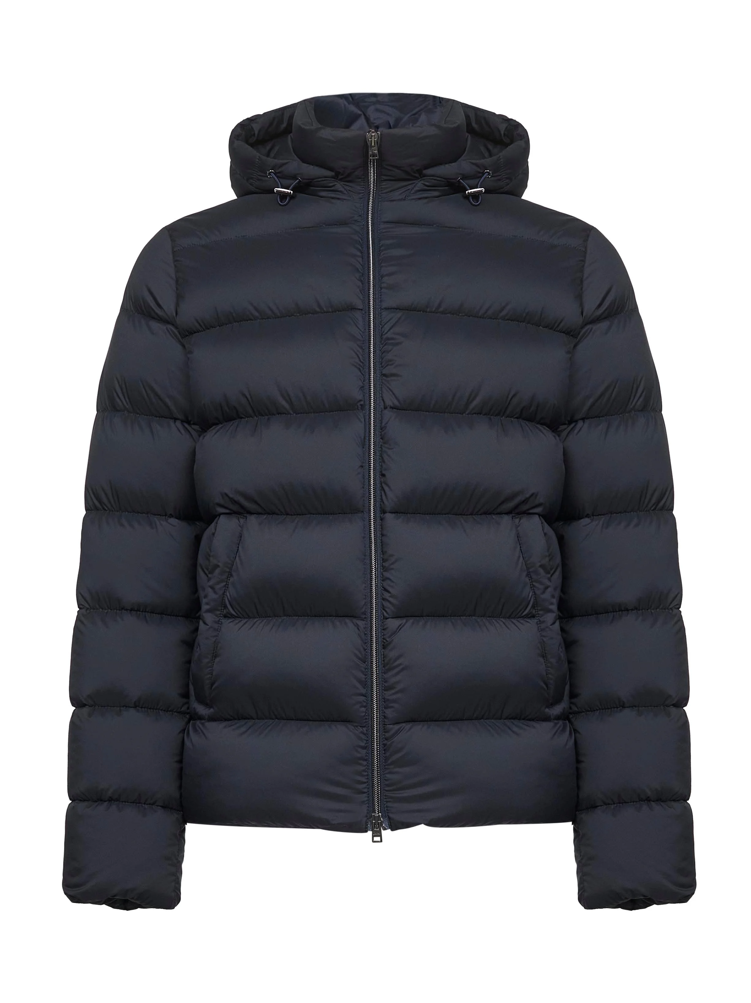 - Front double-slider zip closure - Stand collar; detachable hood with adjustable drawstring - Long sleeves - Side slanted zipped welt pockets - Lined; down and feathers filling - Recycled nylon microfibre design with a lightweight coating at inner side; water-repellent treatment - Regular fit - Blue color - 100% polyamide - Made in romania Synthetic: Polyamide100 % Made in: Romania Season: A25 PI001181U12456Z9200