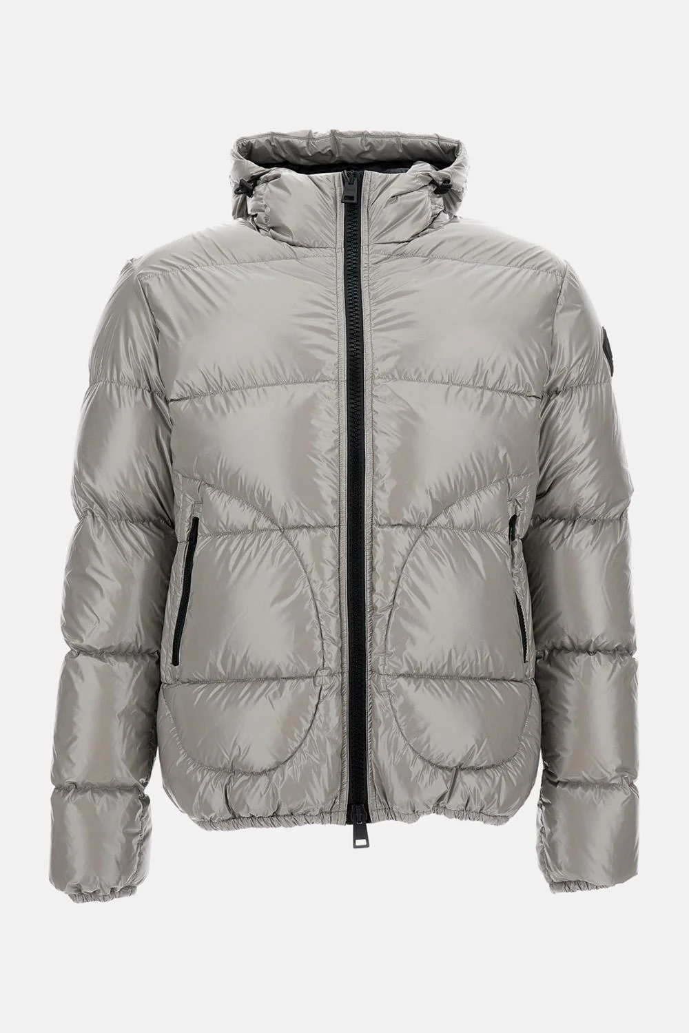 High neck bomber jacket with hood, front zip fastening, side pockets, grey colour. Regular fit Care and details Color: Grey Composition: 100% PA Made in: Armenia Code: PI001133U12220Z9406