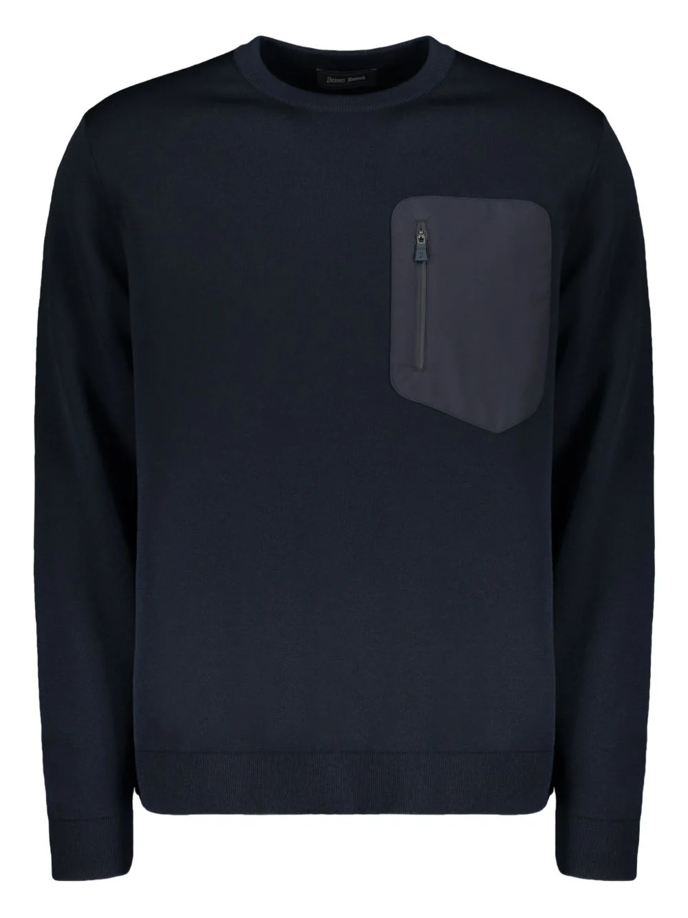 crew-neck pocket sweater Highlights - Dark blue - Front pocket - Crew neck - Long sleeves Made in Italy Composition Virgin Wool 59%, Polyester 39%, Spandex/Elastane 2% Washing instructions Read Manufacturer Guidelines