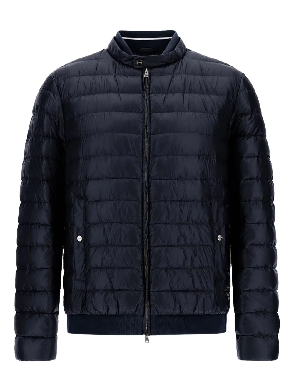 ultralight bomber jacket Highlights - Navy blue - Front zip fastening - Two press-stud fastening side pockets - Band collar - Ribbed hem Made in Italy Composition Lining: Polyamide 100%, Down 90%, Feather 10% Outer: Polyamide 100% Washing instructions Read Manufacturer Guidelines