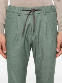 felted trousers Highlights - Sage green - Cashmere-silk blend - Felted - Melange effect - Drawstring fastening - Concealed fly and button fastening - Belt loops - Rear elasticated waistband - Two diagonal pockets to the sides - Two rear jetted pockets - Pleat detailing - Logo plaque - Pressed crease - Tapered leg Made in Italy Composition Outer: Silk 51%, Cashmere 49% Lining: Cotton 100% SIZE & FIT Model measurements Height 6 ft 1 in(1.85 m) Bust/Chest 35.82 in(91 cm) Hips 37.79 in(96 cm) Waist 29.13 in(74 cm) FittingInformation Designed for a tapered leg, offering a loose unrestricted fit over the leg with a closer fit towards the ankle The elasticated waist allows for a comfortable fit Made from a midweight non-stretch fabric