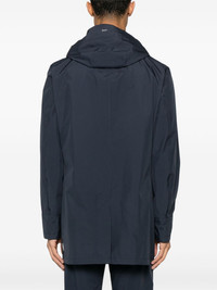 hooded raincoat Highlights - Navy blue - Front zip fastening - Fitted-cuff sleeves - Two side welt pockets - Central rear vent Made in Italy Composition Polytrimethylene Terephthalate (PTT) 100%, Polyester 100%, Polyamide 75%, Elastane 25% SIZE & FIT Model measurements Height 6 ft 2 in(1.89 m) Bust/Chest 37.4 in(95 cm) Hips 37.4 in(95 cm) Waist 29.52 in(75 cm) FittingInformation Designed to be unstructured, offering a loose fit throughout The vented hem offers movement at the rear Made from a lightweight non-stretch fabric
