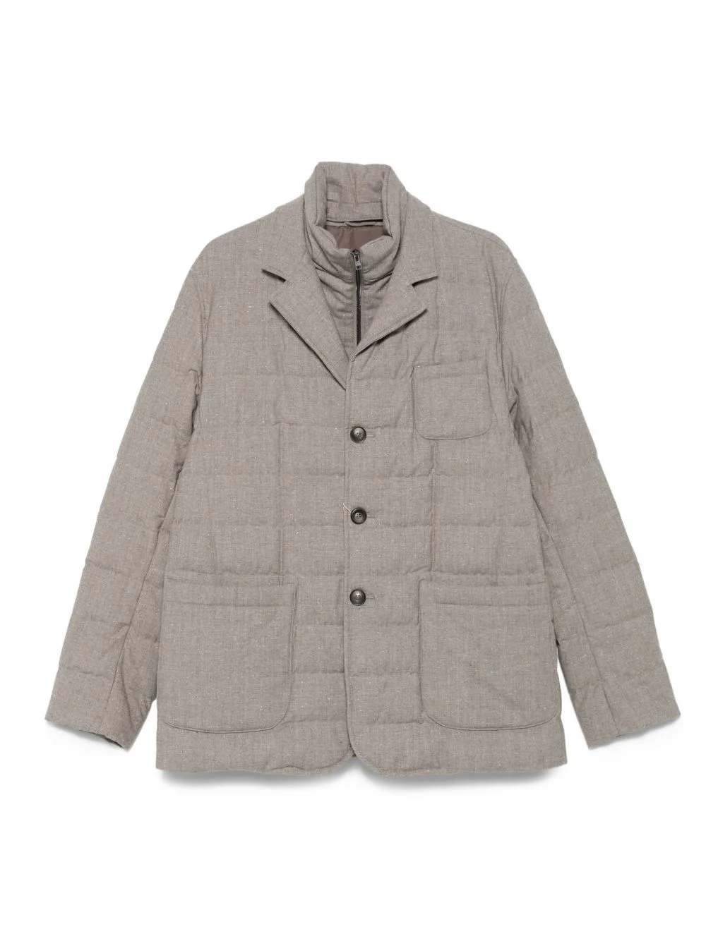 quilted jacket Highlights - Grey - Quilted design - Four button fastening - Patch pockets - High neck - Wool blend Imported Composition Outer: Wool 78%, Viscose 13%, Silk 5%, Elastane 3%, Linen/Flax 1% Lining: Polyester 100%, Goose Down 90%, Goose Feather 10% Washing instructions Dry Clean Only