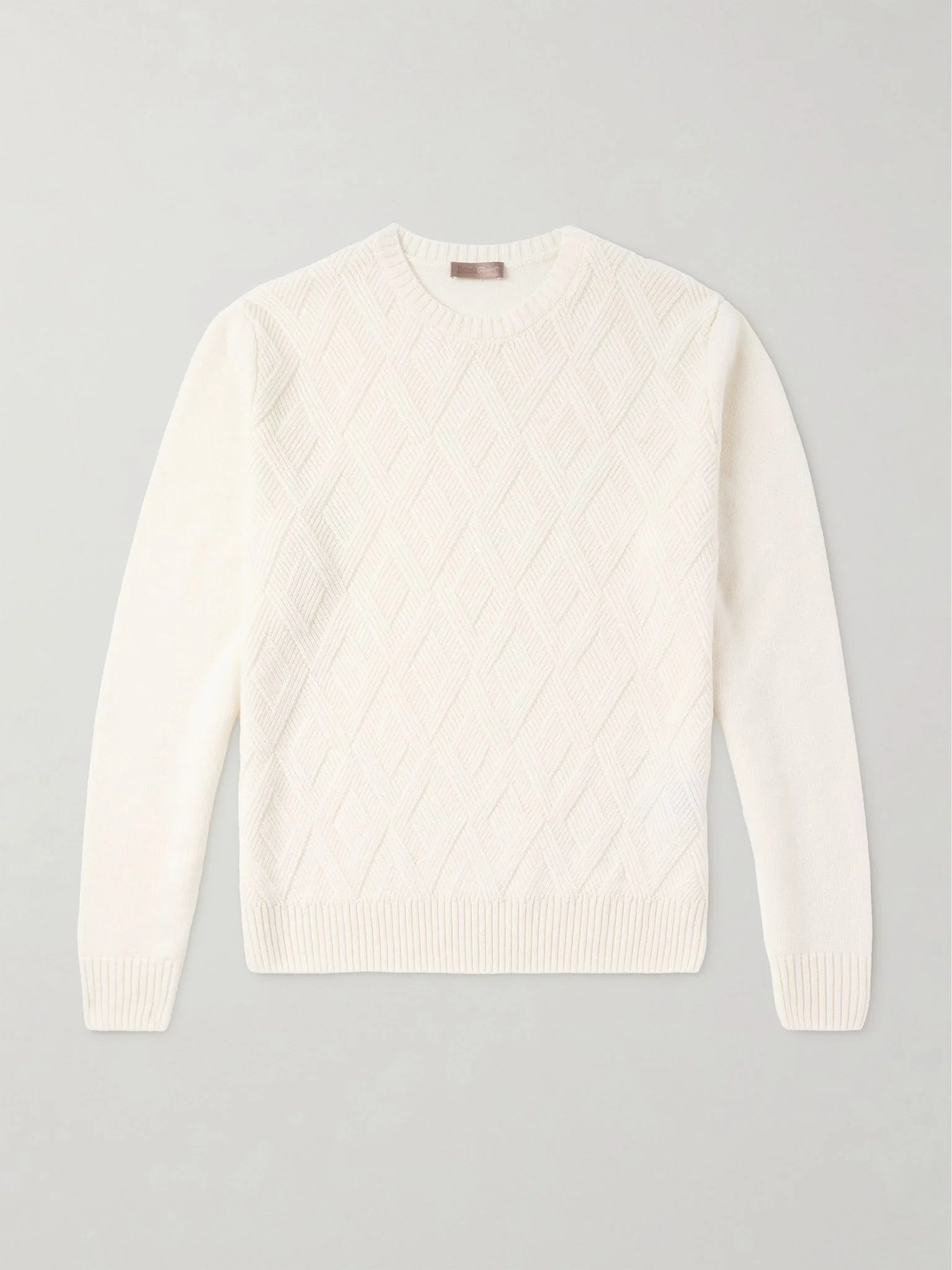 Herno's sweater is knitted in a diagonal stitch that's reminiscent of traditional argyle. It's been made in Italy from soft, insulating cashmere and has ribbed trims to hold its shape. Size & Fit - Fits true to size. Take your normal size - Designed for a regular fit - Mid-weight knit - Model is shown wearing an IT 48 - Model measures: chest 38"/ 96cm, height 6'0"/ 183cm Details & Care - White cashmere - 100% cashmere - Dry clean