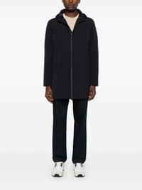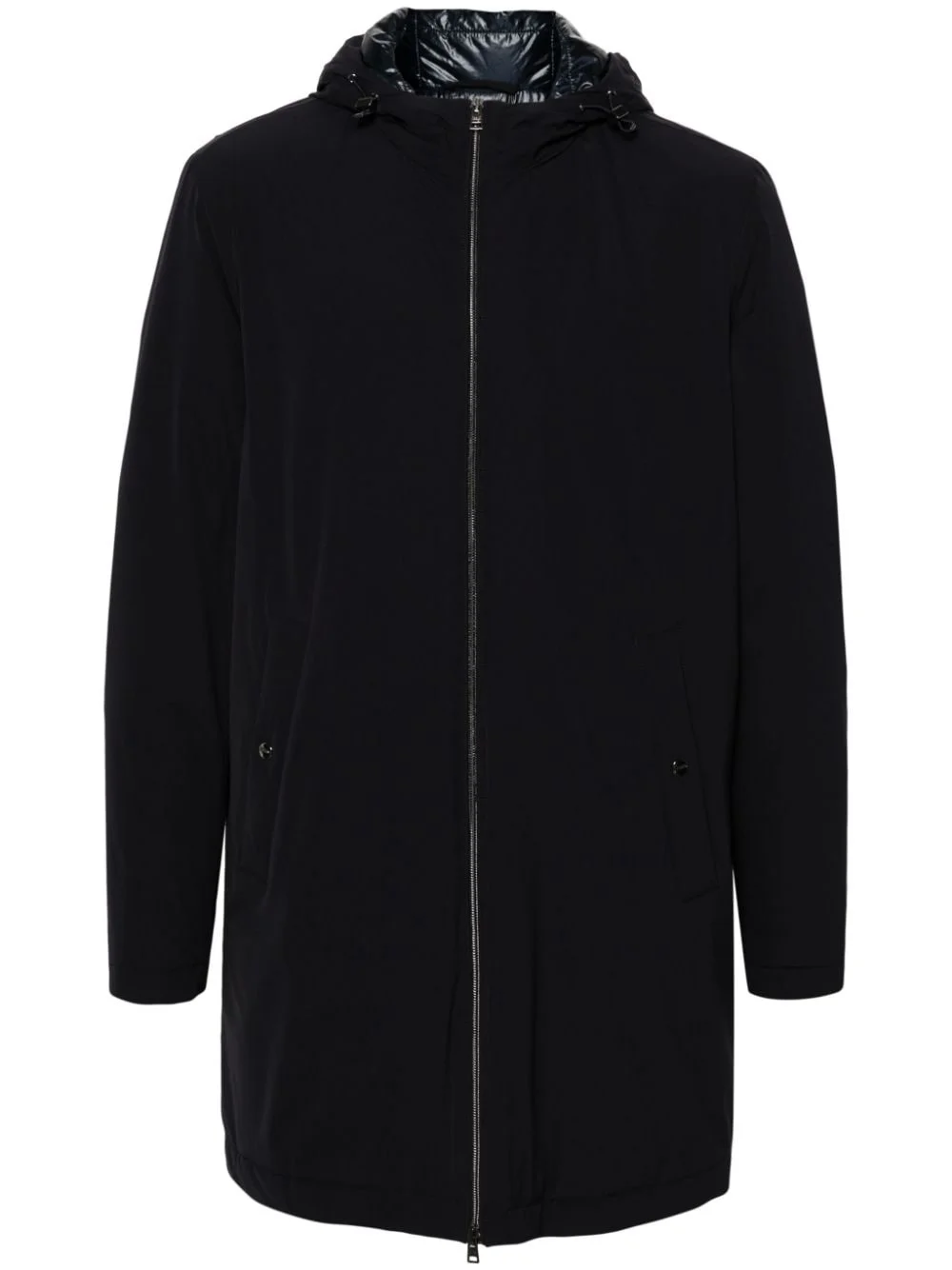 lightweight hooded parka coat Highlights - Lightweight - Navy blue - Lightweight - Drawstring hood - Long sleeves - Two front welt pockets - Straight hem - Full lining - Front two-way zip fastening Made in Italy Composition Lining: Polyamide 100%, Polyurethane 100%, Polyester 100% Outer: Polyamide 86%, Spandex/Elastane 14% SIZE & FIT Model measurements Height 6 ft 2 in(1.88 m) Bust/Chest 36.61 in(93 cm) Hips 35.82 in(91 cm) Waist 27.95 in(71 cm) FittingInformation Designed for a slim fit, offering a comfortable fit that sits just away from the body Made from a padded stretch fabric, giving it elasticity and a flexible fit This piece fits true to size – take your usual size Washing instructions Dry Clean Only