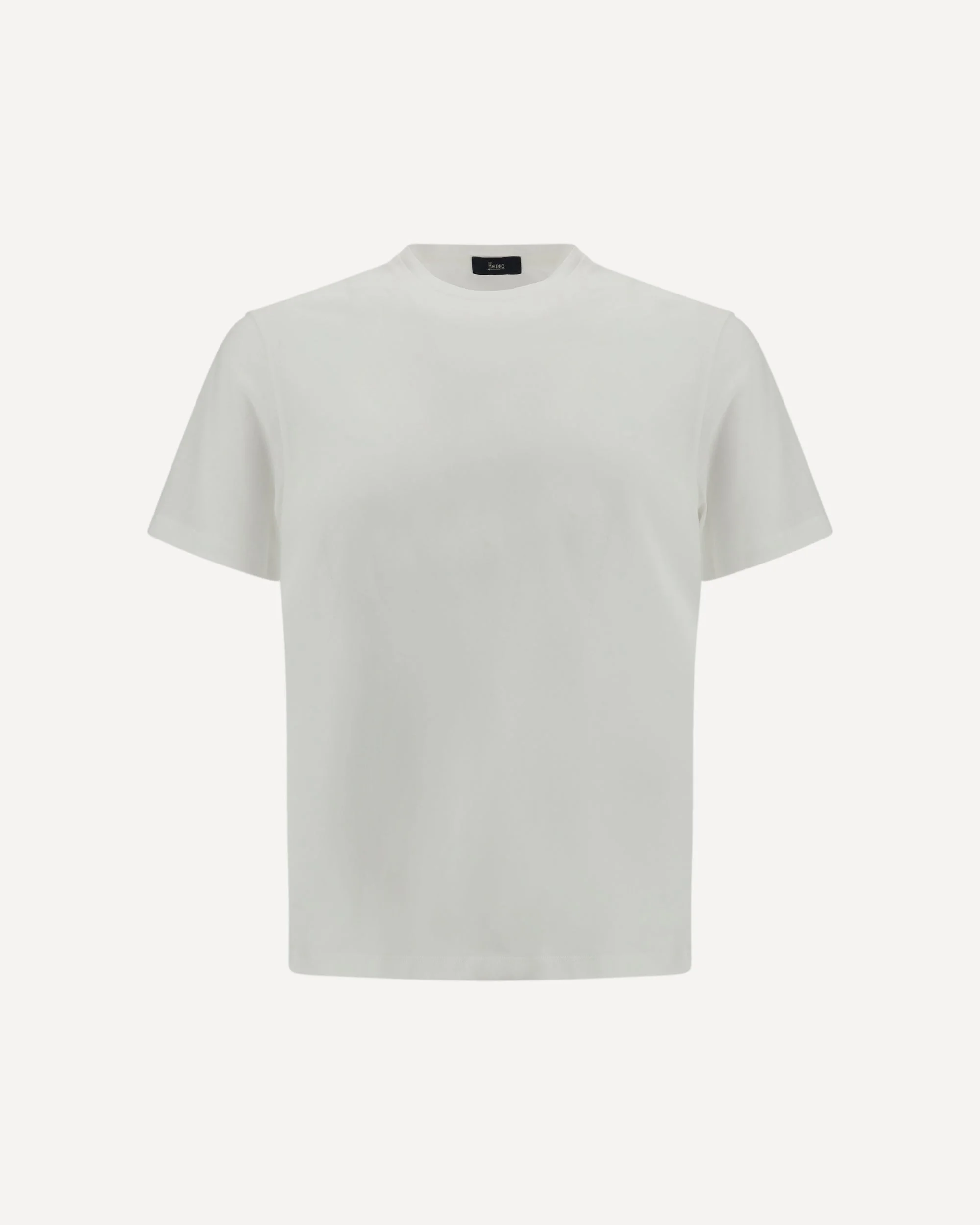 The T-shirt by Herno is crafted from lightweight jersey voile crepe, providing a regular fit and refined comfort. It features a ribbed crew neck, short sleeves, and an elegant silver-tone metal logo plaque at the back of the neck, adding a subtle yet distinctive touch to its minimalist design. DETAILS - Sku: JG000166U52005_1000 - Season: SS26 - Fit: Regular - Composition: GENERAL 100% Cotton - MADE IN ROMANIA