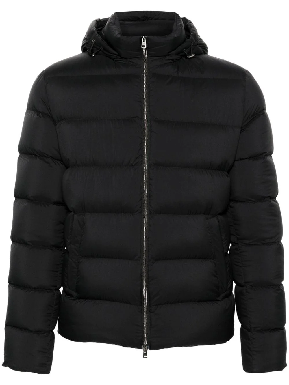 logo plaque jacket Highlights - Black - Goose down - Padded design - Front two-way zip fastening - Detachable drawstring hood - Long sleeves - Two press-stud fastening side pockets - Silver-tone logo plaque - Multiple internal slip pockets - Full lining - Straight hem Imported Composition Outer: Polyamide 100%, Polyurethane 100% Lining: Polyurethane 100%, Polyamide 100%, Goose Down 90%, Goose Feather 10% SIZE & FIT Model measurements Height 6 ft 2 in(1.87 m) Bust/Chest 35.82 in(91 cm) Hips 35.82 in(91 cm) Waist 31.88 in(81 cm) FittingInformation Designed for a slim fit, offering a comfortable fit that sits just away from the body The internal drawstring at the hem allows for fitted preferences Made from a padded non-stretch fabric, giving it no natural elasticity
