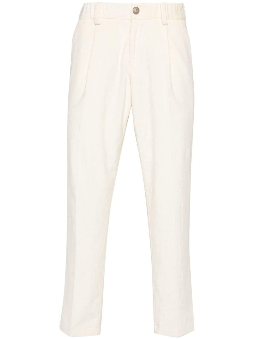 mid-rise tapered trousers Highlights - Ecru - Cotton blend - Corduroy - Pleat detailing - Pressed crease - Mid-rise - Belt loops - Elasticated drawstring waistband - Concealed fly and button fastening - Two side slit pockets - Two rear button-fastening jetted pockets - Tapered leg Imported Composition Lining: Cotton 100% Outer: Cotton 91%, Cashmere 8%, Spandex/Elastane 1% SIZE & FIT Model measurements Height 6 ft 1 in(1.86 m) Bust/Chest 37 in(94 cm) Hips 37 in(94 cm) Waist 29.13 in(74 cm) FittingInformation Designed for a slim tapered leg, offering a close fit that sits just away from the leg with a closer fit towards the ankle Made from a midweight stretch fabric, this piece offers elasticity and flexibility when worn This piece fits true to size – take your usual size