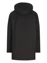 hooded jacket Highlights - Black - Regular fit - Ribbed high collar - Drawstring hood - Covered two-way zip - Press-stud fastening - Welt pockets - Metal logo on the back Imported Composition Polyester 80%, Viscose 20% Washing instructions Read Manufacturer Guidelines