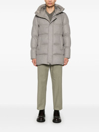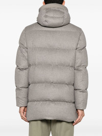 hooded puffer coat Highlights - Light grey - Cashmere-silk blend - Quilted - Concealed front press-stud fastening - Concealed front zip fastening - Padded design - Drawstring hood - Long sleeves - Elasticated cuffs - Two side welt pockets - Full lining Made in Italy Composition Outer: Polyurethane 100%, Polyamide 100%, Polyester 61%, Silk 51%, Cashmere 49%, Cotton 39% Lining: Polyamide 100%, Polyurethane 100%, Cupro 100%, Polyester 100%, Goose Down 90%, Feather Down 10% SIZE & FIT Model measurements Height 6 ft 1 in(1.85 m) Bust/Chest 35.82 in(91 cm) Hips 37.79 in(96 cm) Waist 29.13 in(74 cm) FittingInformation Designed to be unstructured, offering a loose fit throughout The internal drawstring at the hem allows for fitted preferences Made from a padded non-stretch fabric, giving it no natural elasticity Washing instructions Dry Clean Only