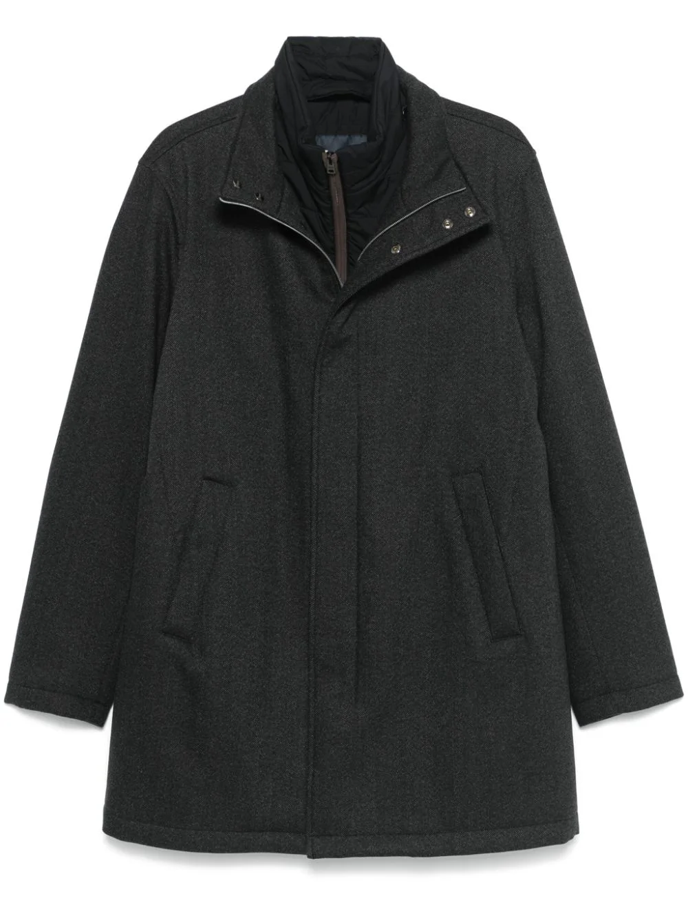 padded coat Highlights - Dark grey - Virgin wool - Padded design - Herringbone - Front press-stud and zip fastening - Stand-up collar - Long sleeves - Two side welt pockets - Quilted lining - Straight hem Made in Italy Composition Lining: Polyamide 100%, Polyester 100%, Polyurethane 100% Outer: Virgin Wool 100%, Polyurethane 100% SIZE & FIT Model measurements Height 6 ft 2 in(1.87 m) Bust/Chest 37.79 in(96 cm) Hips 37.79 in(96 cm) Waist 30.31 in(77 cm) FittingInformation Designed to be unstructured, offering a loose fit throughout The detachable panel offers the preference for a different fit Made from a padded non-stretch fabric, giving it no natural elasticity Washing instructions Dry Clean Only