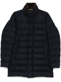 quilted coat Highlights - Midnight blue - Cashmere-silk blend - Down-feather filling - Quilted - Padded design - Water-repellent - Front press-stud and zip fastening - Detachable faux-fur collar - Long sleeves - Two side stud-fastening pockets - Full lining - Straight hem - Above-knee length Made in Italy Composition Outer: Polyester 100%, Polyurethane 100%, Silk 51%, Cashmere 49% Lining: Polyamide 100%, Goose Down 90%, Goose Feather 10% SIZE & FIT Model measurements Height 6 ft 1 in(1.85 m) Bust/Chest 35.82 in(91 cm) Hips 37.79 in(96 cm) Waist 29.13 in(74 cm) FittingInformation Designed to be unstructured, offering a loose fit throughout Made from a padded non-stretch fabric, giving it no natural elasticity Washing instructions Dry Clean Only