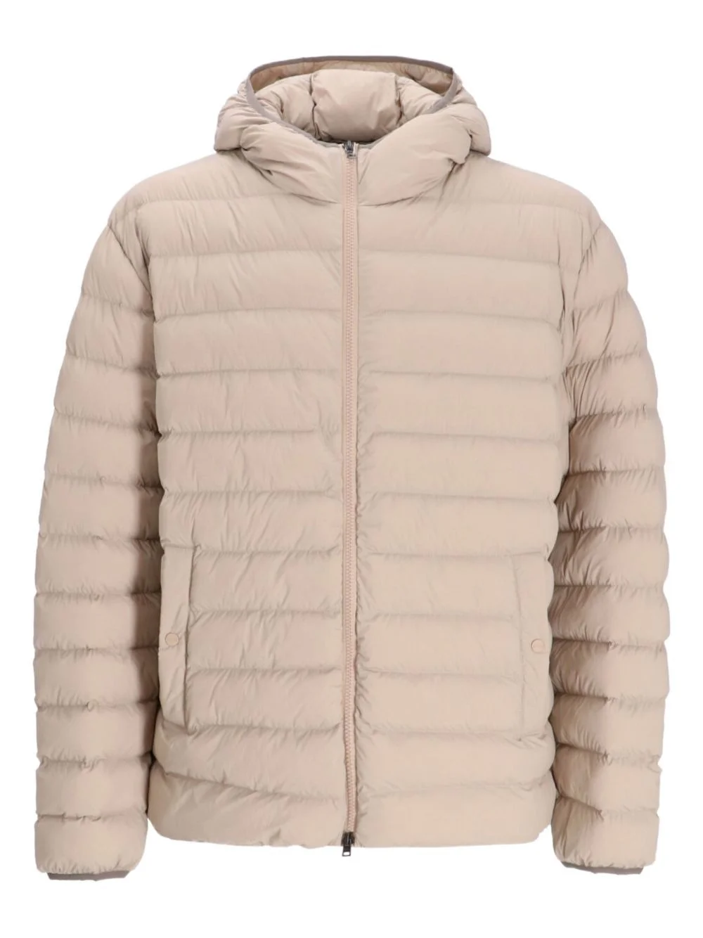 quilted hooded jacket Highlights - Beige - Quilted design - Hooded neckline - Zip fastening - Long sleeves - Horizontal quilting Made in Italy Composition Polyamide 70%, Polyester 30% Washing instructions Read Manufacturer Guidelines