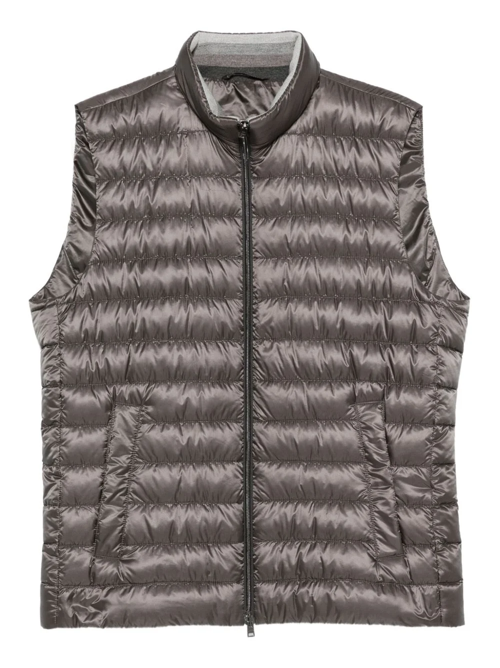 quilted sleeveless vest Highlights - Grey - Quilted design - Zip fastening - High neck - Sleeveless - Two pockets Imported Composition Outer: Polyamide 100% Lining: Polyamide 100%, Goose Down 90%, Goose Feather 10% SIZE & FIT Model measurements Height 6 ft 2 in(1.87 m) Bust/Chest 37.79 in(96 cm) Hips 37.79 in(96 cm) Waist 30.31 in(77 cm) FittingInformation Designed for a slim fit, offering a comfortable fit that sits just away from the body The internal drawstring at the hem allows for fitted preferences Made from a padded non-stretch fabric, giving it no natural elasticity Washing instructions Dry Clean Only