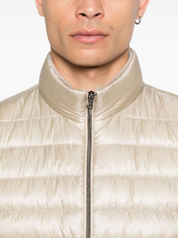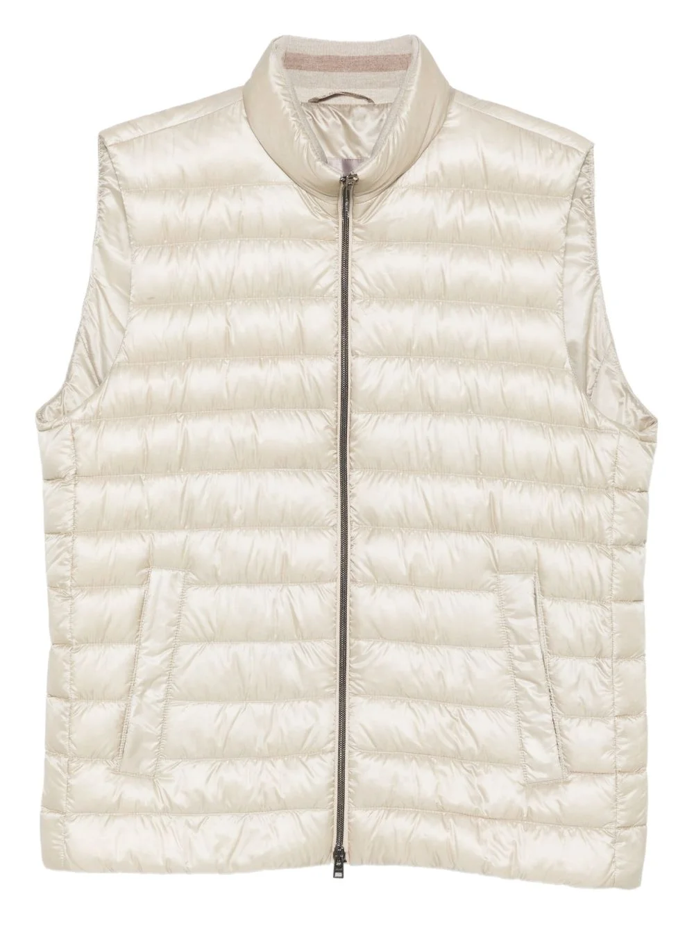 quilted zip-front gilet Highlights - Cream - Quilted design - Zip fastening - High neck - Sleeveless - Welt pockets Imported Composition Lining: Polyamide 100%, Goose Down 90%, Goose Feather 10% Outer: Polyamide 100% SIZE & FIT Model measurements Height 6 ft 1 in(1.85 m) Bust/Chest 35.82 in(91 cm) Hips 37.79 in(96 cm) Waist 29.13 in(74 cm) FittingInformation Designed for a slim fit, offering a comfortable fit that sits just away from the body The internal drawstring at the hem allows for fitted preferences Made from a padded non-stretch fabric, giving it no natural elasticity Washing instructions Dry Clean Only