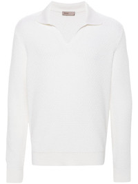Resort polo shirt Highlights - White - Virgin wool - Ribbed knit - Intertwined design - Split neck - Drop shoulder - Long sleeves - Ribbed cuffs and hem - Straight hem Made in Italy Composition Virgin Wool 100% SIZE & FIT Model measurements Height 6 ft 2 in(1.87 m) Bust/Chest 37.79 in(96 cm) Hips 37.79 in(96 cm) Waist 30.31 in(77 cm) FittingInformation Designed for a relaxed fit, this polo shirt offers comfort and movement The ribbed hem offers a close, comfortable fit Made with a midweight knit, this piece offers some stretch This piece fits true to size – take your usual size