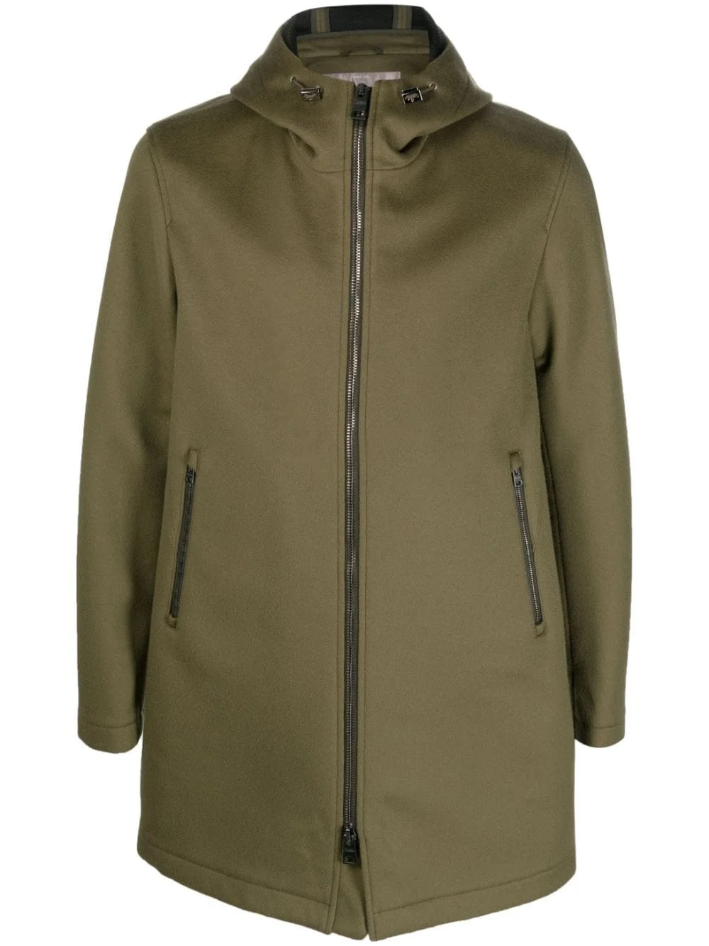 zip-up hooded coat Highlights - Khaki - Wool-cashmere blend - Knitted construction - Logo plaque - Drawstring hood - Front zip fastening - Long sleeves - Two zip-fastening pockets - Thigh-length - Straight hem Made in Italy Composition Outer: Polyester 100%, Wool 60%, Cashmere 30% Lining: Polyester 100% SIZE & FIT Model measurements Height 6 ft 2 in(1.89 m) Bust/Chest 39.76 in(101 cm) Hips 37.4 in(95 cm) Waist 29.92 in(76 cm) FittingInformation Designed for a slim fit, offering a comfortable fit that sits just away from the body Made from a midweight non-stretch fabric, this piece offers minimal elasticity when worn This piece fits true to size – take your usual size Washing instructions Dry Clean Only