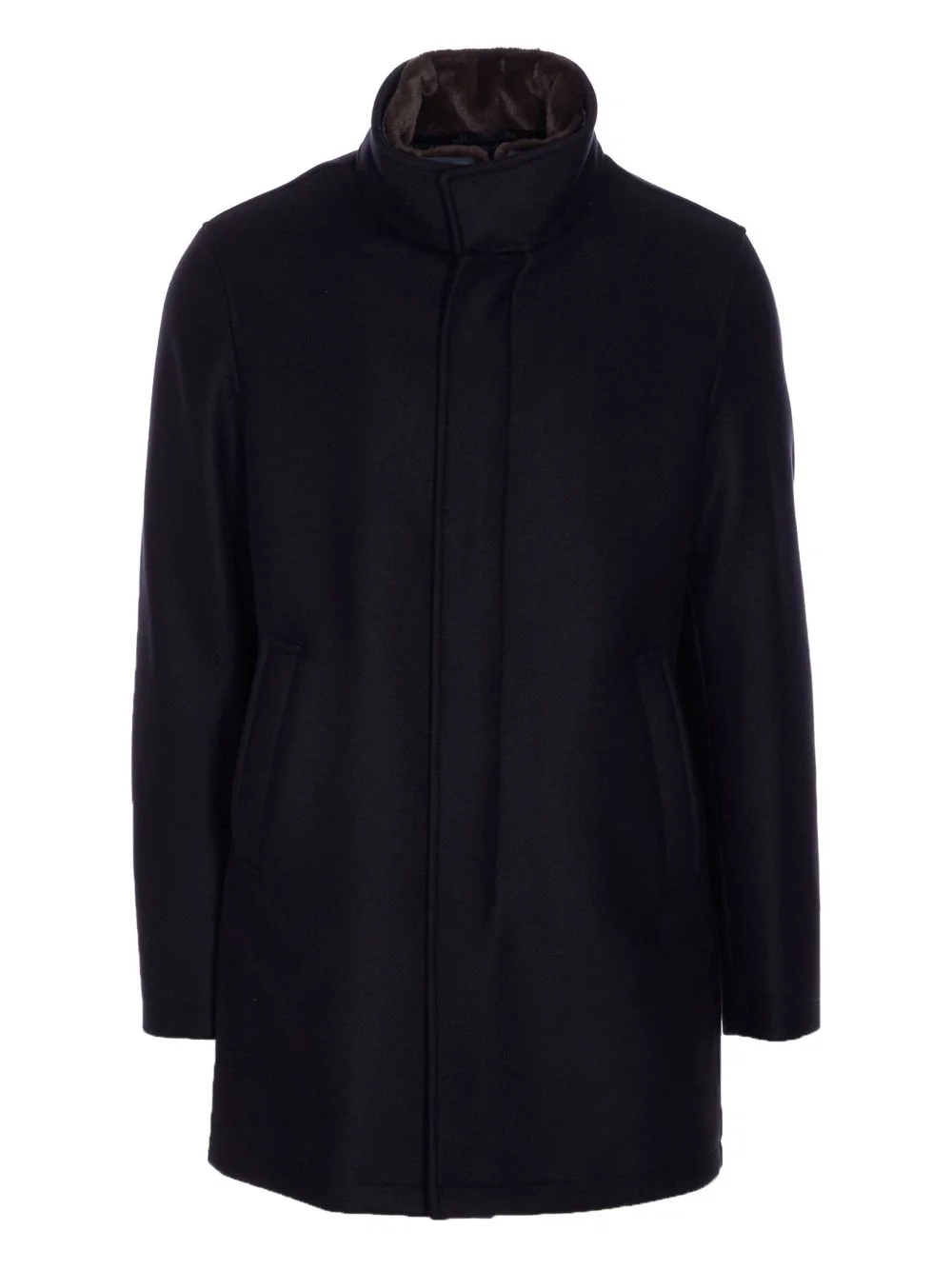 shearling-collar zip-up coat Highlights - Dark blue - Zip fastening - Shearling collar - Side welt pockets Made in Italy Composition Polyester 100%, Wool 75%, Polyamide 25% Washing instructions Read Manufacturer Guidelines