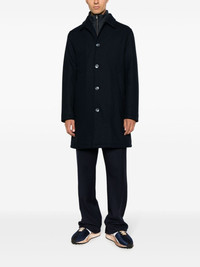 single-breasted layered coat Highlights - Navy blue - Virgin wool - Layered design - Classic collar - Front button fastening - Long sleeves - Two side inset pockets - Mid-length - Straight hem Made in Italy Composition Outer: Virgin Wool 100%, Polyurethane 100%, Polyester 100% Lining: Polyamide 100%, Polyester 100% SIZE & FIT Model measurements Height 6 ft 1 in(1.85 m) Bust/Chest 35.43 in(90 cm) Hips 35.82 in(91 cm) Waist 27.55 in(70 cm) FittingInformation Designed to be unstructured, offering a loose fit throughout The detachable panel offers the preference for a different fit Made from a midweight non-stretch fabric This piece fits true to size – take your usual size Measurement CHEST 45.27 in(115 cm) SLEEVE LENGTH 34.25 in(87 cm) WAIST 44.88 in(114 cm) Shoulder Width 17.71 in(45 cm)