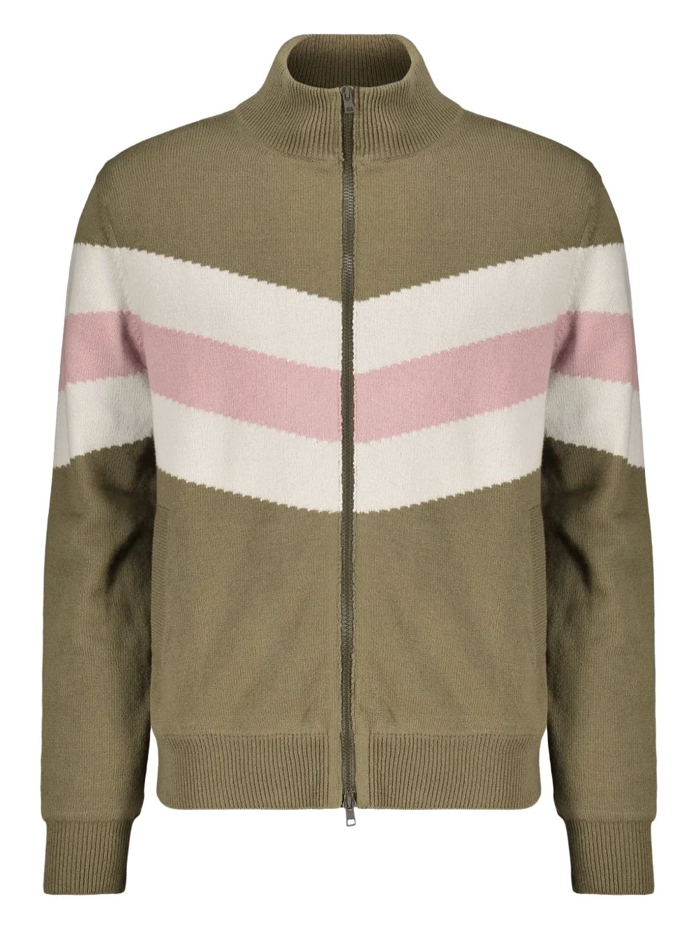 striped high-neck cardigan Highlights - Olive green - Striped design - Zip closure - High neck - Long sleeves Made in Italy Composition Wool 50%, Polyamide 43%, Spandex/Elastane 7% Washing instructions Read Manufacturer Guidelines