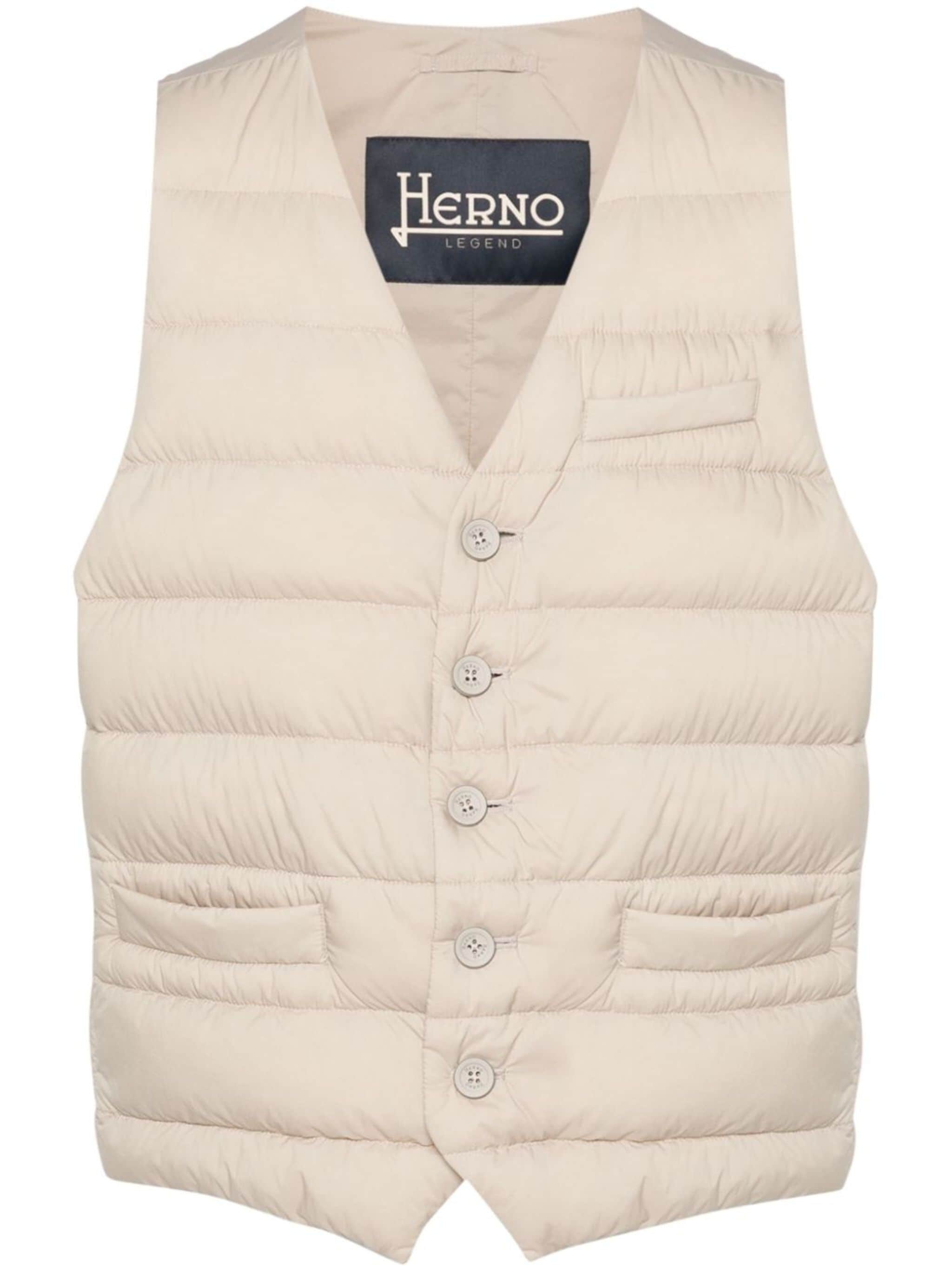 beige down-feather filling quilted lightweight construction insulated design V-neck front button fastening sleeveless chest welt pocket two front patch pockets internal zip-fastening pockets high-low hem full lining Size & Fit Model Measurements: Height: 1.88 m Bust/Chest: 95.0 cm Hips: 92.0 cm Waist: 72.0 cm Model wears size 50 Fabric and Care Designer Style ID: PI002ULE12456Z Designer Colour: 1985 BROWN Composition: Outer: Polyamide 100%, Polyurethane 100%; Lining: Polyester 100%, Feather 10%, Down 90%, Polyamide 100%, Polyurethane 100% Washing instructions: Dry Clean Only Made in Romania