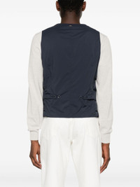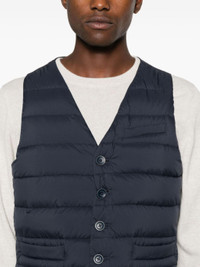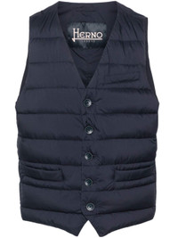 prussian blue down-feather filling quilted lightweight construction insulated design V-neck front button fastening sleeveless chest welt pocket two front patch pockets internal zip-fastening pockets high-low hem full lining Size & Fit Model Measurements: Height: 1.88 m Bust/Chest: 95.0 cm Hips: 92.0 cm Waist: 72.0 cm Model wears size 50 Fabric and Care Designer Style ID: PI002ULE12456Z Designer Colour: 9202 BLUE Composition: Outer: Polyamide 100%, Polyurethane 100%; Lining: Feather 10%, Down 90%, Polyamide 100%, Polyester 100% Washing instructions: Dry Clean Only Made in Romania