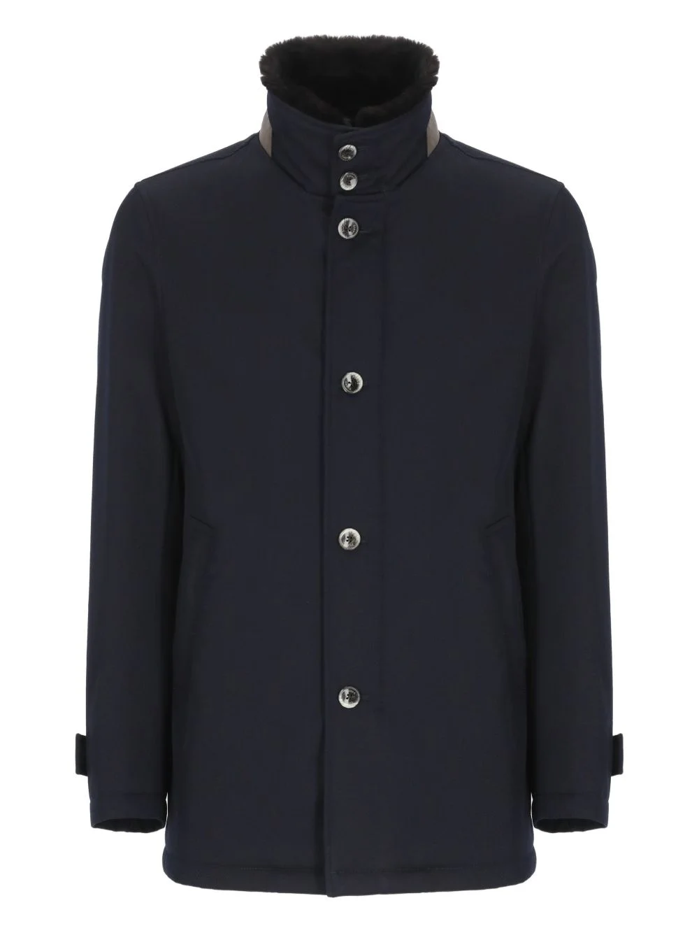 virgin wool coat Highlights - Navy blue - Front button fastening - Two side welt pockets - Shearling collar Made in Italy Composition Lining: Polyamide 100%, Polyester 100% Outer: Virgin Wool 100%, Polyurethane 100%, Lamb Fur 100%, Polyester 90%, Spandex/Elastane 20% Washing instructions Read Manufacturer Guidelines