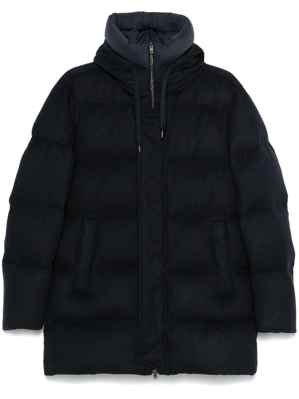 water-repellent coat Highlights - Navy blue - Silk blend - Goose down - Padded design - Quilted - Water-repellent - Waterproof - Matte finish - Front press-stud and zip fastening - Drawstring hood - Stand-up collar - Long sleeves - Elasticated cuffs - Two front welt pockets - Internal slip pocket - Full lining - Drawstring hem Made in Italy Composition Lining: Polyamide 100%, Cupro 100%, Polyurethane 100%, Polyester 100%, Goose Down 90%, Goose Feather 10% Outer: Polyamide 100%, Polyurethane 100%, Polyester 61%, Silk 51%, Cashmere 49%, Cotton 39% SIZE & FIT Model measurements Height 6 ft 2 in(1.88 m) Bust/Chest 35.43 in(90 cm) Hips 36.61 in(93 cm) Waist 27.95 in(71 cm) FittingInformation Designed for a regular fit, allowing for a comfortably loose fit throughout the body The internal drawstring at the hem allows for fitted preferences Made from a padded non-stretch fabric, giving it no natural elasticity
