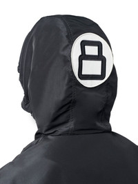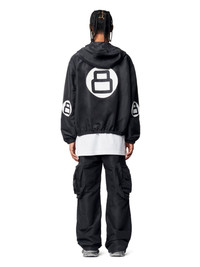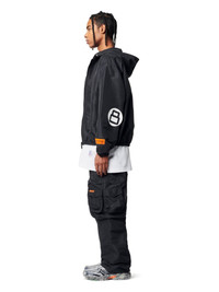 Black nylon hooded windbreaker featuring white stamp at back, sleeves and hood. Orange logo patch at sleeve. Elasticated cuffs and hem, zip closure. 100% Polyester Model Omar Diagne wears size M Height: 6’ 1” (185 cm) Chest: 33” (84 cm) Waist: 28” (73 cm) Product ID: HMEB014S23FAB0011001