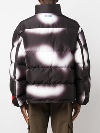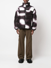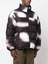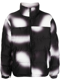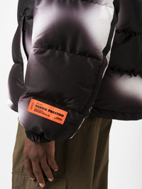 blurred puffer jacket Heron Preston's puffer jacket encapsulates the brand's streetwear influences. Crafted from recycled textiles, the relaxed silhouette is distinguished by a blurred finish in a black-and-white palette. The signature orange logo patch lands on the sleeve for a pop of colour. Highlights - Black/white - Blurring - Logo patch at the sleeve - Funnel neck - Front zip fastening - Long sleeves - Two side zip-fastening pockets Imported Composition Outer: Polyester 100% Lining: Polyester 100% SIZE & FIT Model measurements Height 6 ft 0 in(1.84 m) Bust/Chest 36.22 in(92 cm) Hips 35.43 in(90 cm) Waist 26.77 in(68 cm) FittingInformation Designed to be unstructured, offering a loose fit throughout The internal drawstring at the hem allows for fitted preferences Made from a padded non-stretch fabric, giving it no natural elasticity This piece fits true to size – take your usual size Washing instructions Machine Wash