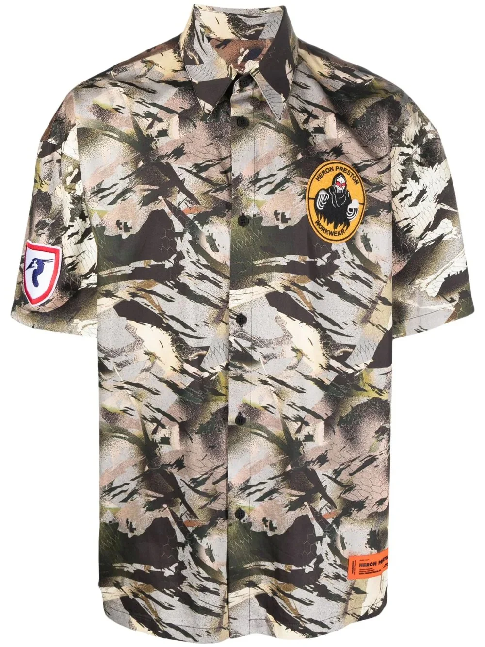 camouflage-print bowling shirt Defined by its all-over camouflage print, Heron Preston's bowling shirt is crafted in a soft cotton construction and accented with multiple patches for a utilitarian-style completion. Highlights - Green/brown - Cotton - Logo patch to the front - Patch detail - Camouflage pattern - Classic collar - Front button fastening - Drop shoulder - Short sleeves Imported Composition Cotton 100% SIZE & FIT Model measurements Height 5 ft 10 in(1.77 m) Bust/Chest 30.7 in(78 cm) Hips 35.43 in(90 cm) Waist 23.22 in(59 cm) FittingInformation This piece fits true to size. We recommend you get your regular size Cut for a loose fit Made with a mid-weight non-stretch fabric Washing instructions Dry Clean Only