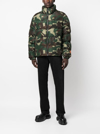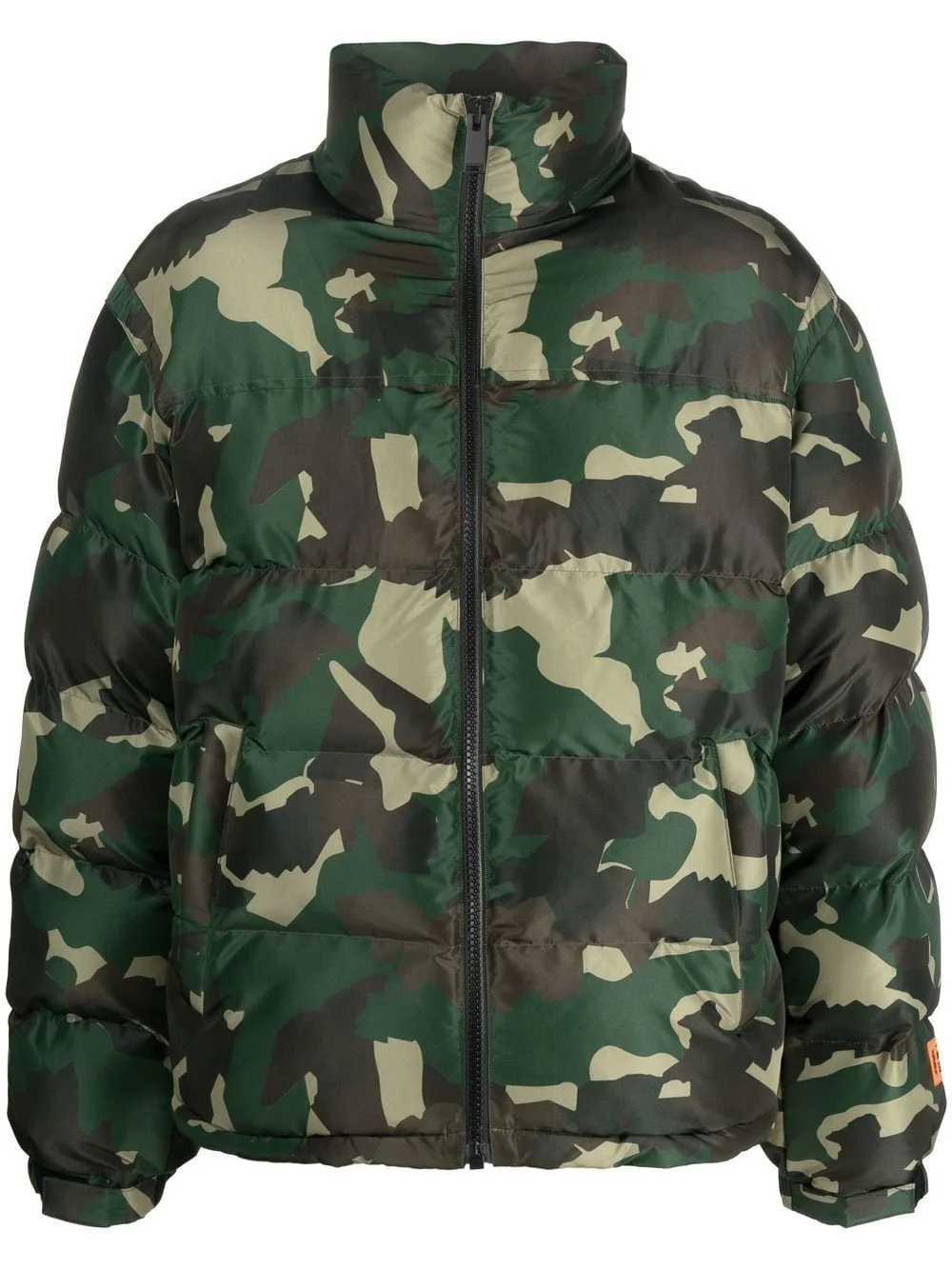 camouflage-print padded jacket military green camouflage print padded design logo patch at the sleeve high neck front zip fastening Imported Composition Outer: Polyester 100% Lining: Polyester 100%