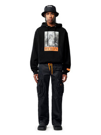 Black long sleeves hoodie featuring graphic print to the front. Heron Preston orange logo patch sewn at sleeves.Kangaroo pocket. Tonal strings. Ribbed edge. The outer fabric of this garment is made with 100% organic cotton material. 100% Cotton 95% Cotton 5% Elastane Model Omar Diagne wears size M Height: 6’ 1” (185 cm) Chest: 33” (84 cm) Waist: 28” (73 cm) Product ID: HMBB024C99JER0031010
