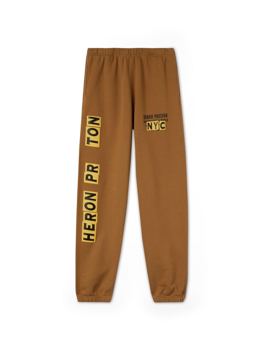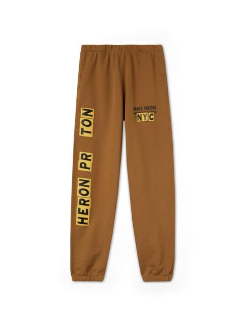 Camel sweatpants with Heron Preston stamp at leg. Orange logo patch at back. The outer fabric of this garment is made with 100% organic cotton material. 100% Organic Cotton 100% Polyester Model Omar Diagne wears size 48 Height: 6’ 1” (185 cm) Waist: 28” (73 cm) Hips: 36” (91 cm) Product ID: HMCH027F22JER0056419