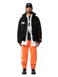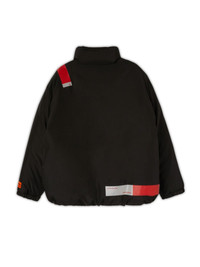 Pufffer jacket in black. Snap front buttons. Two-pockets at front. Red and gray patch on front, back and top. Orange logo patch at sleeve. The outer fabric of this garment is made with 100% recycled polyester material. 100% Polyester 100% Polyester Model Omar Diagne wears size M Height: 6’ 1” (185 cm) Chest: 33” (84 cm) Waist: 28” (73 cm) Product ID: HMED012F22FAB0011000