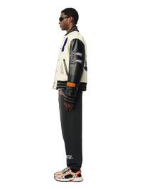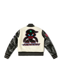 varsity-patches bomber jacket from HERON PRESTON featuring cream white, black, colour-block design, appliqué detailing, striped edge, baseball collar, front press-stud fastening, two diagonal pockets to the sides, long sleeves and elasticated hem. 100% Bovine Leather (top grain) 25% Nylon 100% Polyester 75% Virgin Wool 100% Polyester 10% Nylon 2% Elastane 44% Acrylic 44% Wool Bust 0cm Height 0cm Hips 0cm Waist 0cm Product ID: HMEK001F23FAB0010425