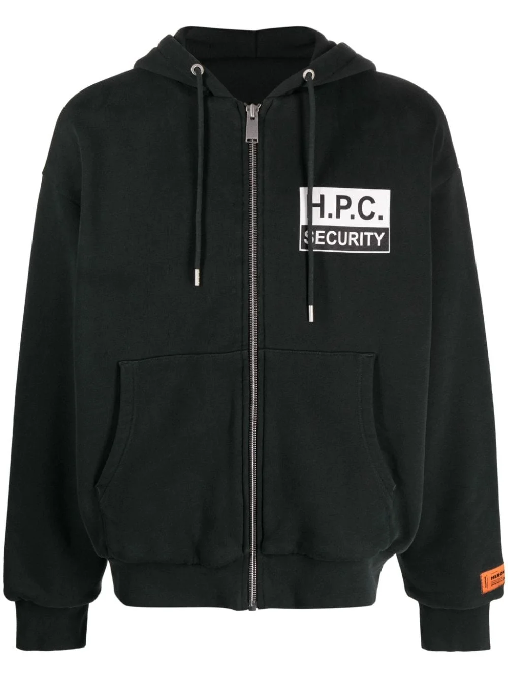 H.P.C Security Tape cotton hoodie Made in Portugal, this zip-up hoodie demonstrates Heron Preston's laid-back style. It's embellished with the signature H.P.C Security Tape logo print, while on the back, a slogan boldly states 'Warning: MIND YOUR BUSINESS'. Highlights - Black/white/yellow - Cotton - Logo print at the chest - Slogan print to the rear - Drawstring hood - Front zip fastening - Drop shoulder - Long sleeves - Ribbed trim - Straight hem Imported Composition Cotton 100% SIZE & FIT Model measurements Height 6 ft 2 in(1.87 m) Bust/Chest 36.22 in(92 cm) Hips 37 in(94 cm) Waist 27.95 in(71 cm) FittingInformation Designed to be unstructured, offering a loose fit throughout The ribbed hem offers a close, comfortable fit Made from a midweight non-stretch fabric, this piece offers minimal elasticity when worn This piece fits true to size – take your usual size Washing instructions Machine Wash