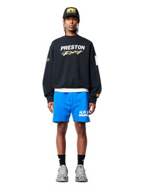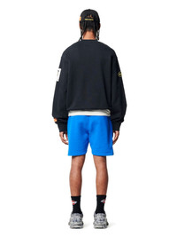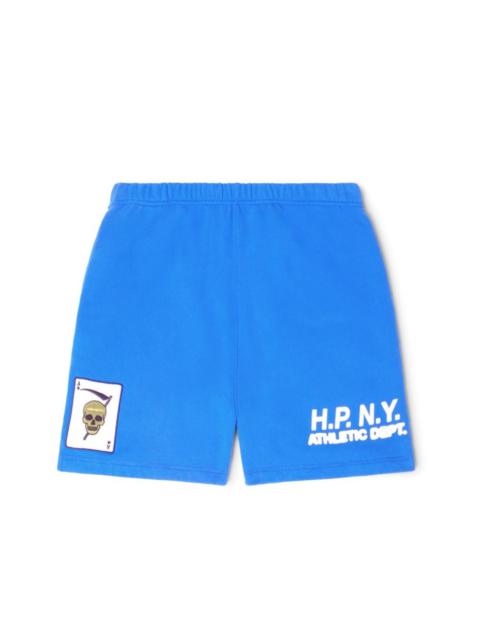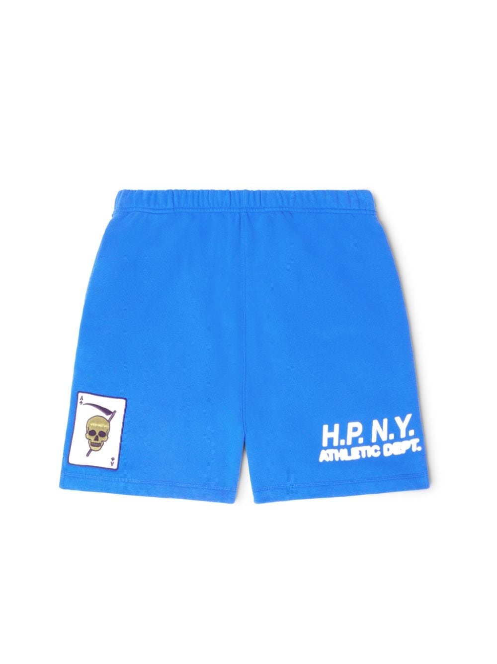 Blue sweatshorts featuring white stamp at front and skull design embroidered at side. Orange logo patch at back. Two side pockets, elasticated waistband. 100% Cotton Model Omar Diagne wears size 48 Height: 6’ 1” (185 cm) Waist: 28” (73 cm) Hips: 36” (91 cm) Product ID: HMCI011S23JER0014501